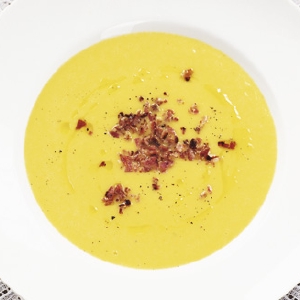 Gul paprikasoppa med knaprig pancetta