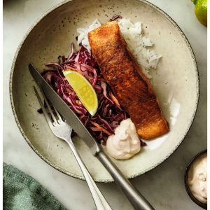 Kryddstekt lax med syrlig rödkålssallad