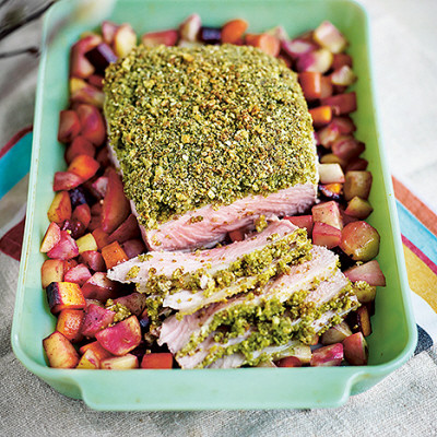 Lägg alla ingredienserna till örttoppingen i en mixer/matberedare och mixa till ett grönt smul. Täck köttet med toppingen och stek i mitten av ugnen till en innertemperatur på 70°, ca 1 timme.
