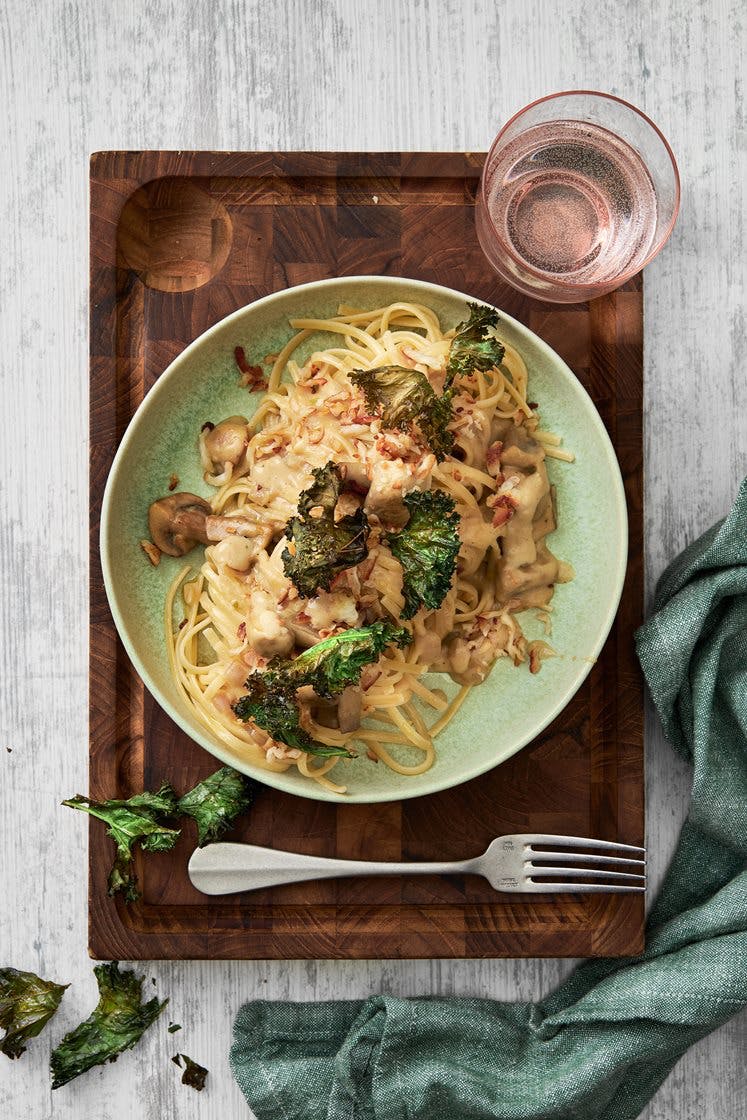 Blanda väl avhälld pasta med svampsåsen. Toppa med halloumi och grönkål. Servera direkt!