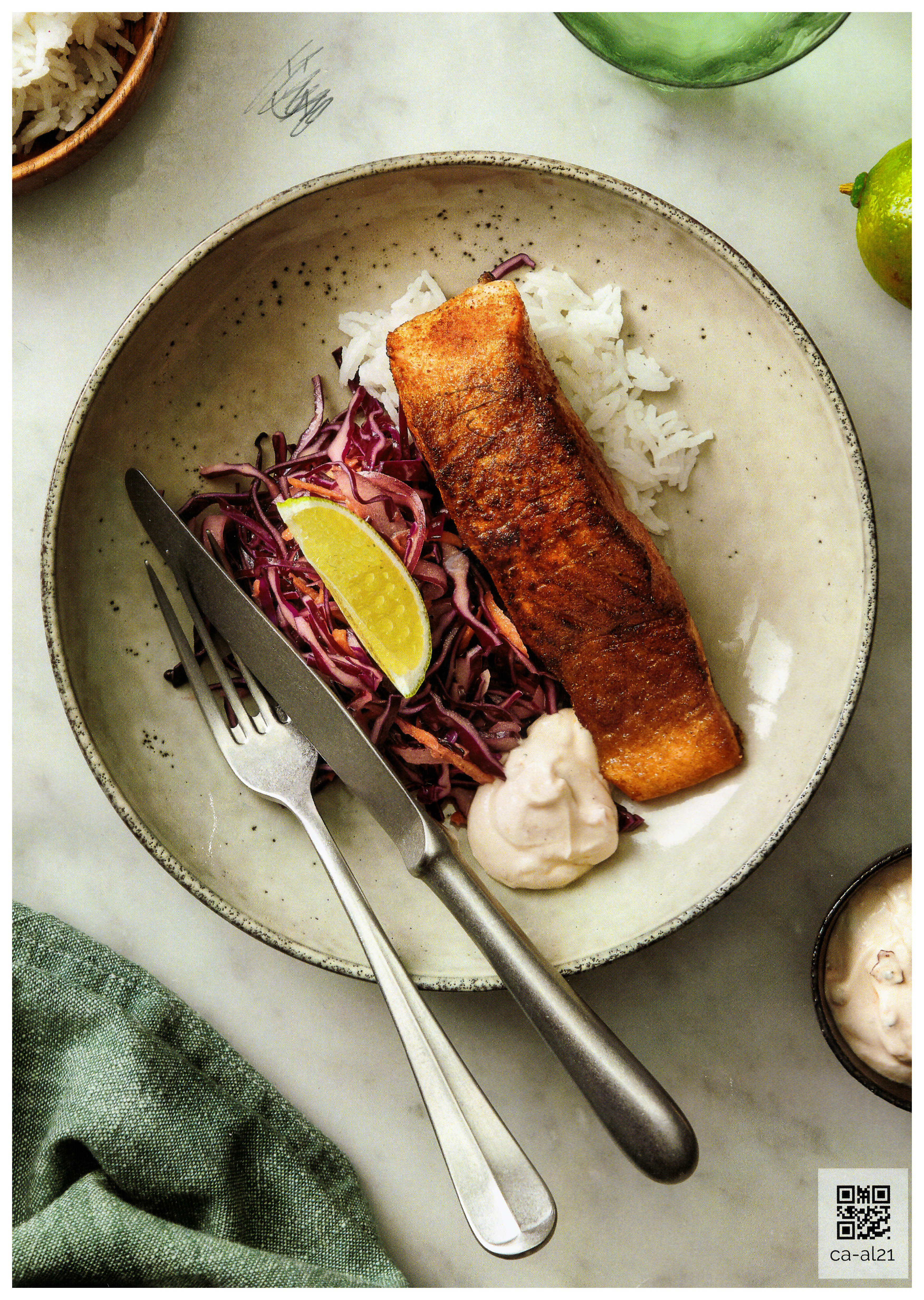 Servera nystekt lax med rödkålssallad, chiliyoghurt, limeklyfta och basmatiris,