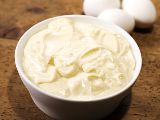 - Vispa jämt medan du droppvis häller i oljan. När hälften av oljan är ivispad kan du hälla i resten lite fortare