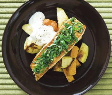 Örtlax: Stek laxen runt om i smör och olja. Pressa över citronjuicen. Strö över salt, peppar och de hackade örterna. Servera laxen med rotfrukter och aioliyoghurt.