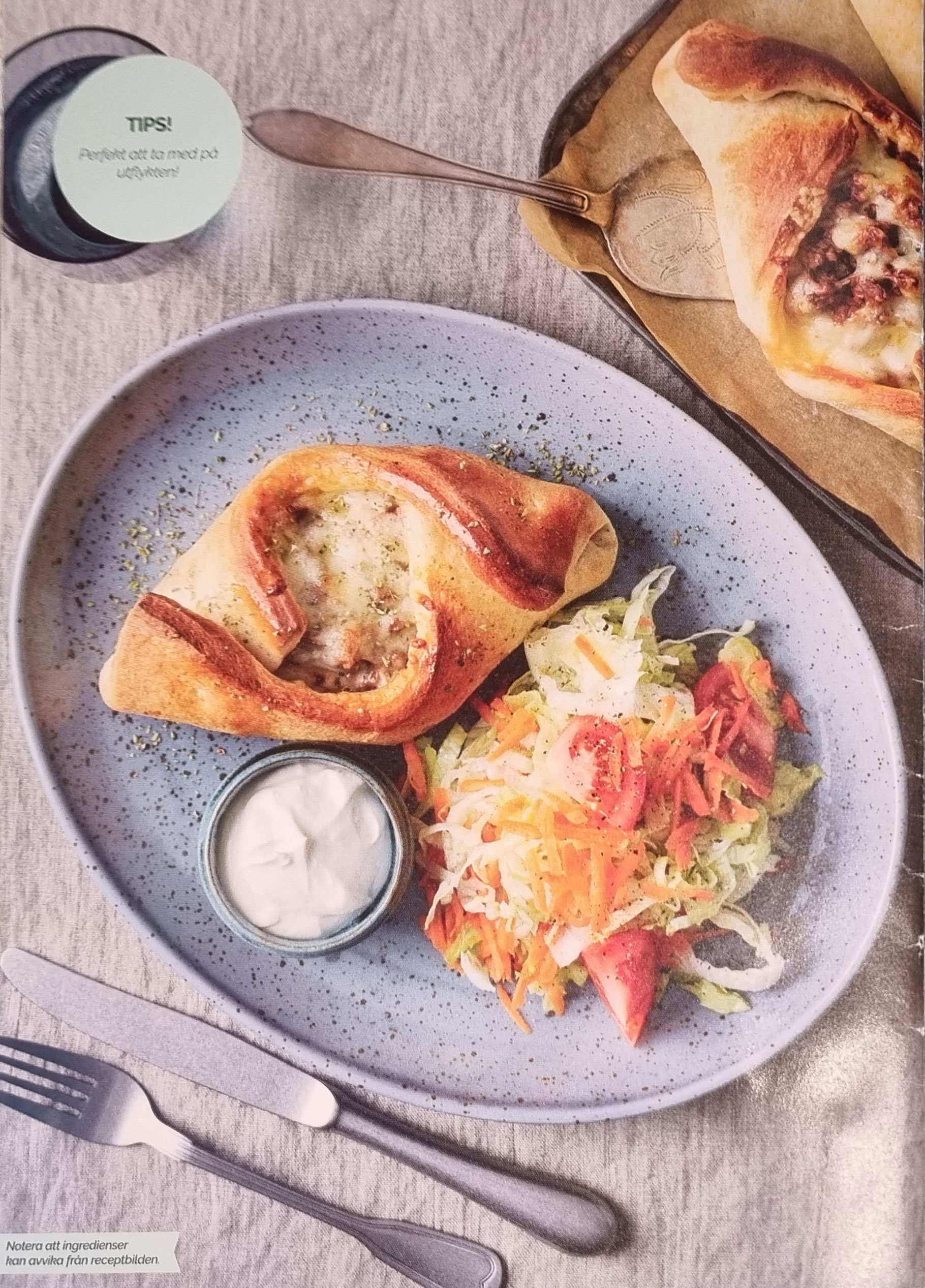 Servera köttfärsfyllda piroger med pizzasallad, grönsaker och yoghurtklick