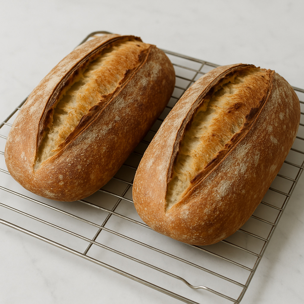 Låt bröden svalna på galler innan du skär i dem. Njut av ditt hembakta surdegsbröd!